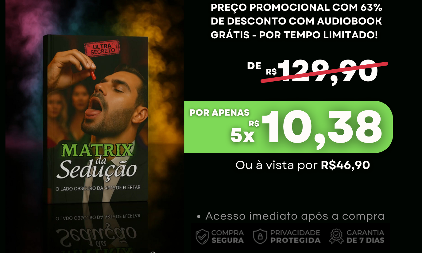 O acesso ao "Matrix da Sedução" é imediato e exclusivo. Basta clicar no botão de compra, preencher seus dados e garantir sua cópia. Em poucos minutos, você receberá em seu e-mail o PDF, contendo a versão digital, e estará pronto para desvendar os segredos da Matrix e se tornar um mestre da sedução. Mas aviso: esse preço promocional é por tempo limitado.. Não perca essa oportunidade de transformar sua vida amorosa para sempre.